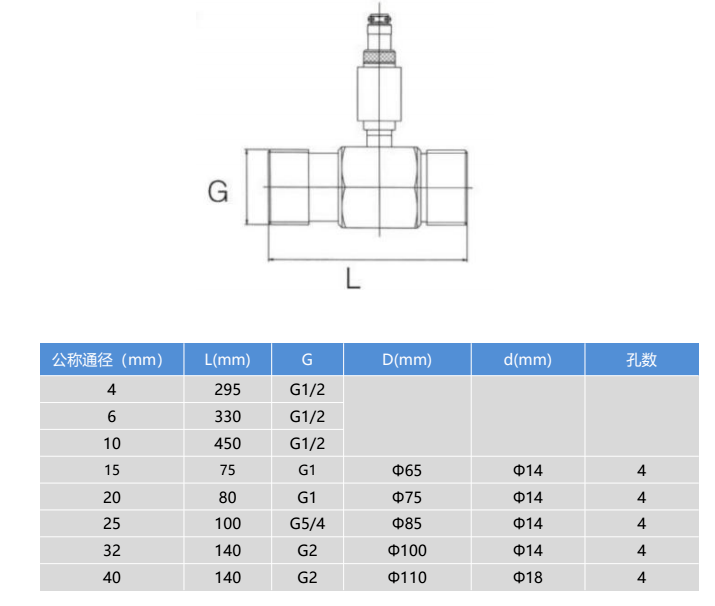 | 儀表口徑(mm) 及連接方式 | 4、6、10、15、20、32、40采用螺紋連接 |